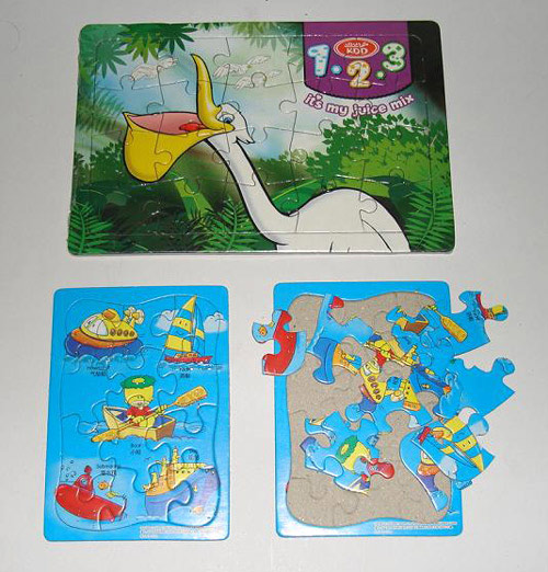 1.材料:纸板\PP\PET 纸+EVA, 材料厚度:纸板2mm 3mm厚, PP 0.6mm2.工艺:四色印刷 UV上光 糊裱 磨具冲压3.包装:每套OPP包装4.设计:按照客户图稿5.起订量:1000pcs可以商议6.用途:益智儿童玩具、广告促销用